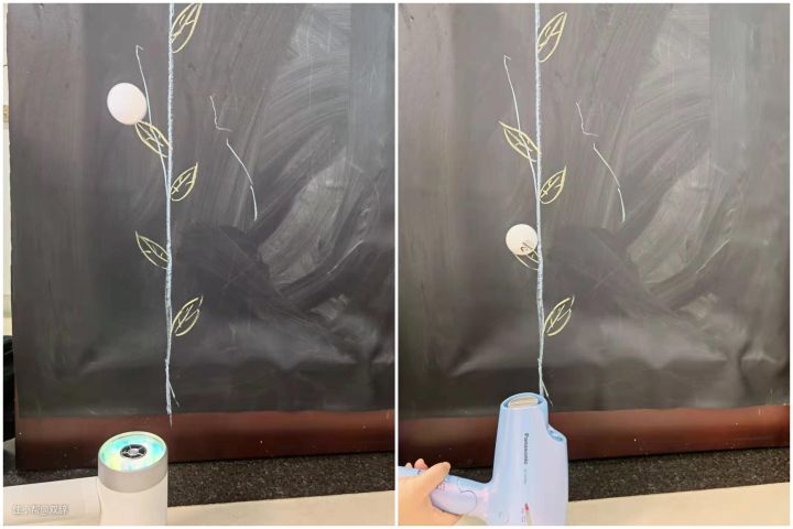 眼见为实,原里吹风机相比于松下吹风机来说,明显能把乒乓球吹得更高,这也证实了它的出风量确实杠杠的。