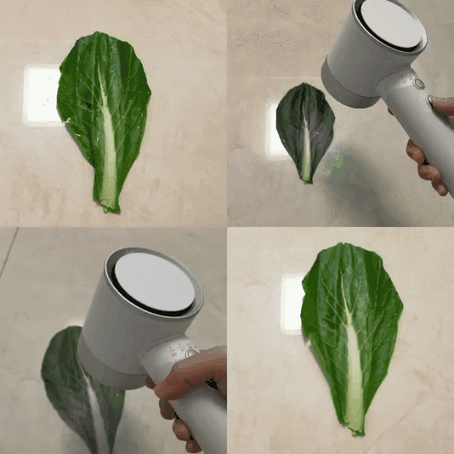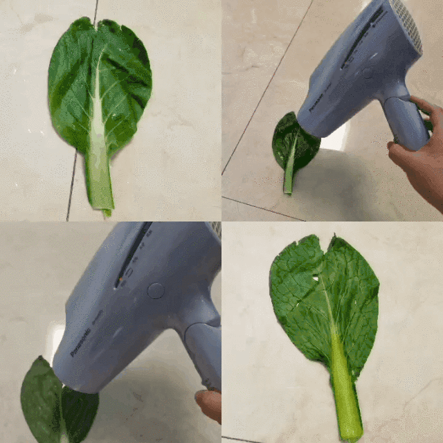 风力、干发速度一些基本功能测完之后,护发效果还是比较看重的,原里的核心卖点是锁水。除了真人吹发比较,我还做了一个吹菜叶实验。