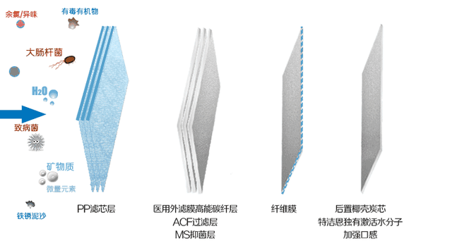我一直提到的RO反渗透膜或者超滤膜,只是净水器方案中的核心关键。而净水器采用的滤芯方案,往往还有其他滤芯进行辅助型过滤。如标准的过滤方案,为五级过滤,会采用PP棉、高精度PP棉、碳纤维、活性炭颗粒、RO反渗透滤膜。RO反渗透膜已经介绍过它的核心作用了,下面就简单的介绍其他四类滤芯的作用。