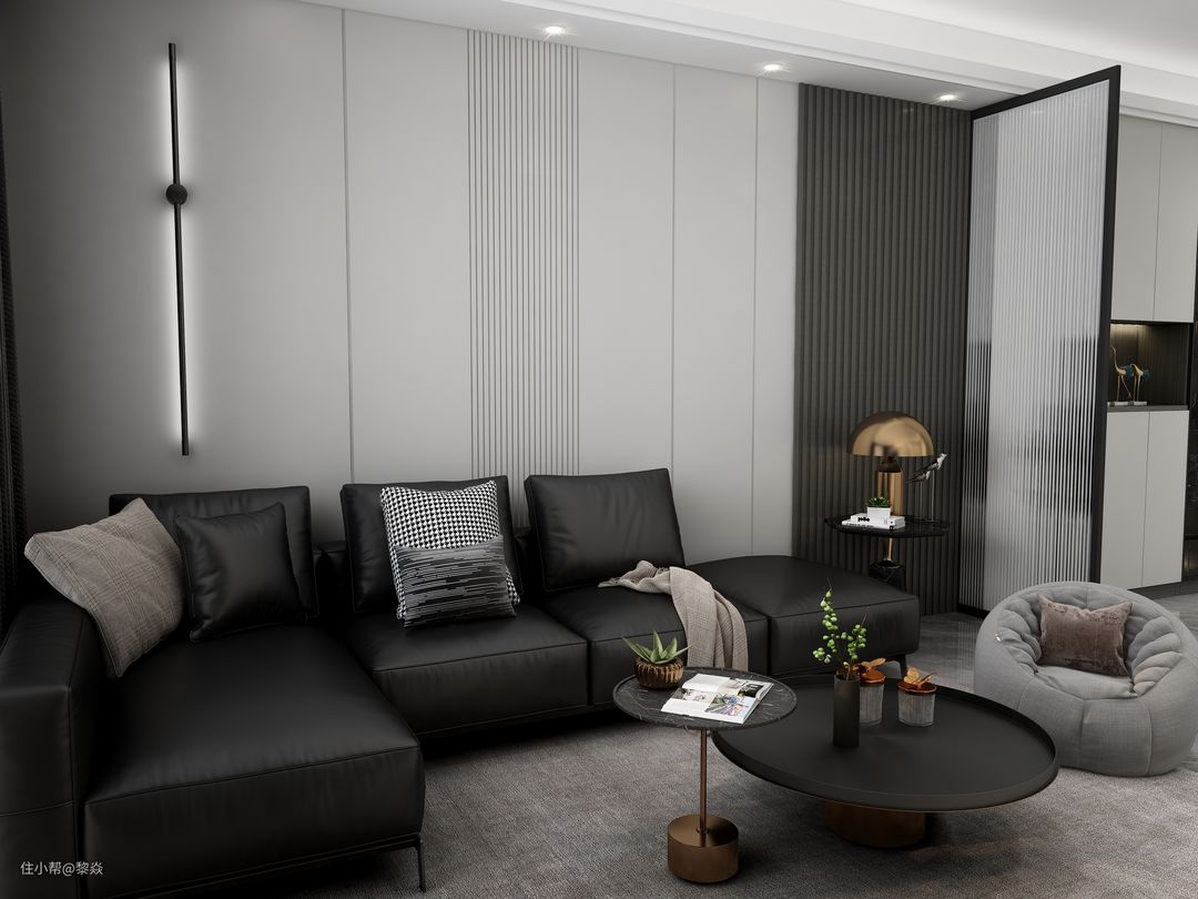 客厅沙发背景墙采用灰色调墙板和深灰色木格栅的组合、爵士白悬空电视背景墙和隔断入户视觉的长虹玻璃,搭配着黑色真皮沙发,此时不同材质与造型的碰撞,凸显整体高级质感。