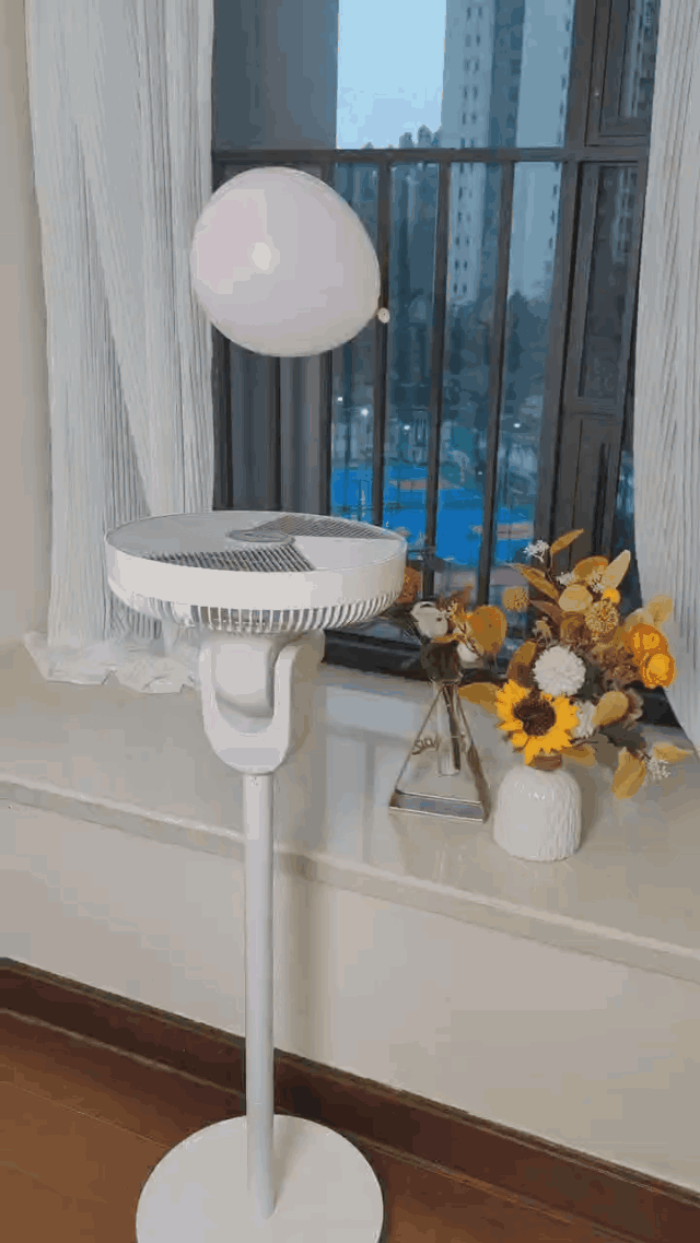 接下来我将通过用风扇吹气球的方式来测试这款空气循环扇的稳定性。先把风扇头部向上摇动90º,打开风扇,将气球置于风扇上方,看看气球能够稳定的飘在风扇上方,以此判断这款空气循环扇出风的稳定性。