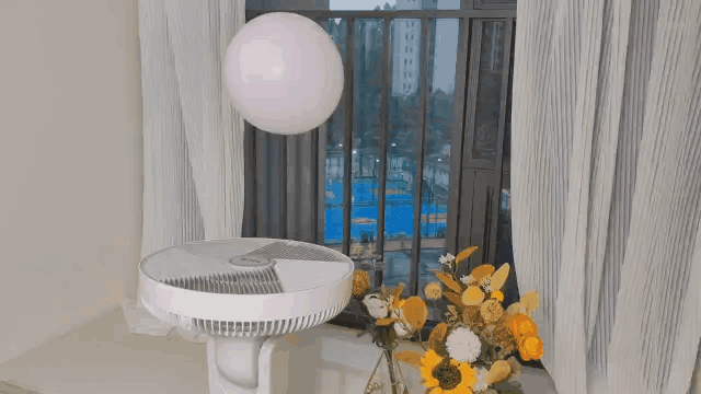 可以看到气球在风扇上方飘动还是比较稳定的,不会出现大幅度的摇晃,也没有被吹走。阿卡驰这款空气循环扇它的风是聚拢的,出风更加集中,风力更猛,且送风的距离更远。通过强大的气流来搅动室内空气,以达到室内空气循环流动,从而带给人一种微风徐徐的体验。