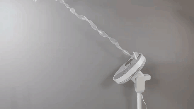 我家里没有专业检测风距的设备,那咱们就简单粗暴的找一根彩带来实测阿卡驰循环扇最远能把彩带吹起来的距离吧(测量了一下彩带多长度大概是2.6m,完全能够支撑彩带整条飞起的。风距肯定比吹起彩带的距离远)