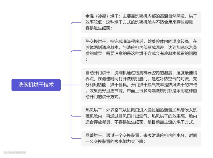 如果没有烘干功能,湿哒哒的餐具在洗碗机内部这种潮湿的环境下就会滋生细菌,所以为了家人健康着想,购买时一定要选择有烘干功能的洗碗机;市面上主流的烘干技术主要有5种