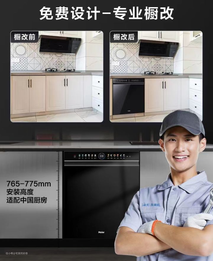 底部采用内嵌式设计,在安装的时候能够和橱柜共用踢脚线,更好地保持了橱柜整体的美观性。如果是家里的橱柜高度有出入的话,还可以联系海尔的售后进行免费的专业橱改,当初选择海尔也有一部分原因是它的服务比较贴心。