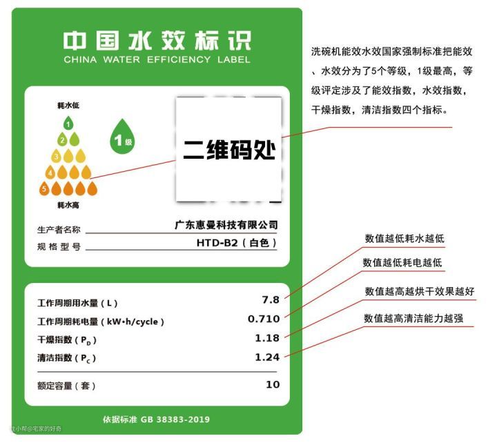 节水节电方面最直观的就是直接看洗碗机上面张贴的中国水效标识,最好选择清洁指数为1.12、干燥指数为1.08的一级水效标准,有一些高端的洗碗机甚至能做到超一级水效;