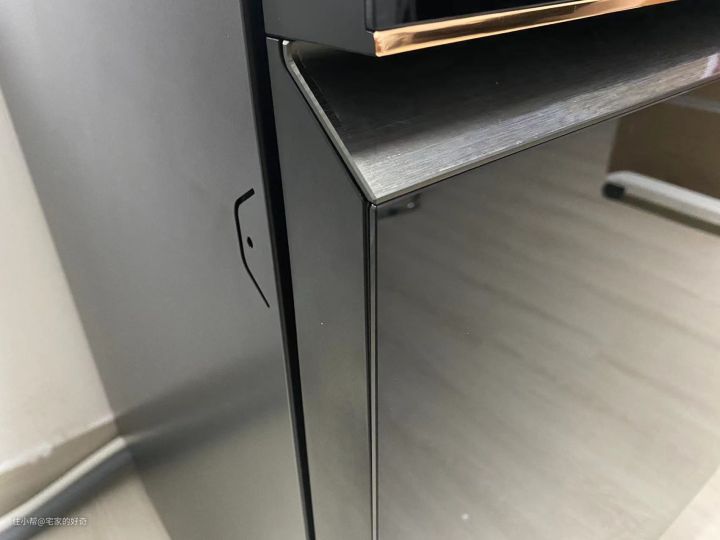 开门把手采用的是符合人体工学设计的凹槽式设计,相比抽拉式,凹槽式设计会更方便我们日常使用,不需要太多的弯腰就能随手开拉,同时也能够避免了开门时柜体磕碰到其他家具电器的情况。