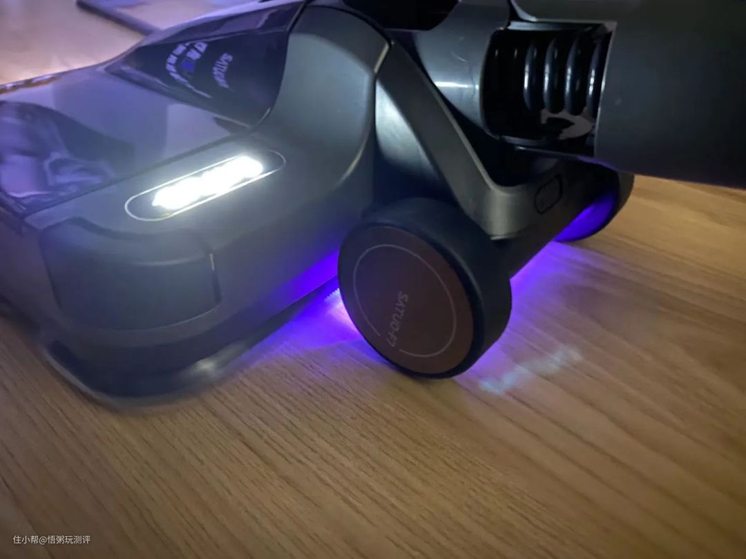 整个吸拖头采用四轮助力设计,使用起来更顺手,底部自带自动光感地面照明灯,可以方便用户更加清晰的看到地面灰尘,特别适合强迫症星人,机身带有光敏感感应开关和UV紫外线杀菌开关 ,适用于木地板、瓷砖、大理石等地面的清洁,不仅可以吸地拖地,还具有紫外线杀菌、木地板打蜡和除醛功能。