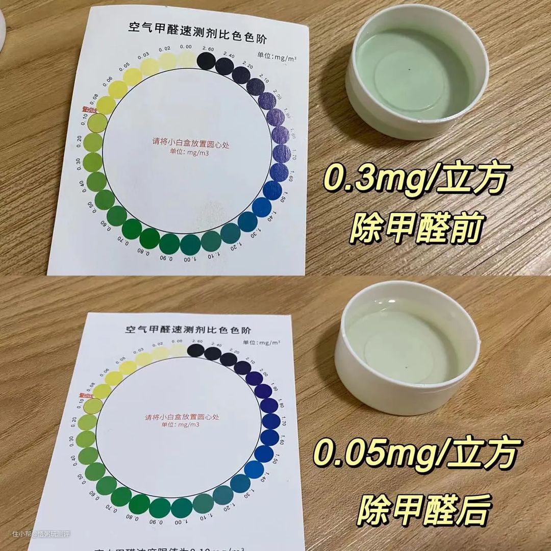 从上图可以看到,使用除醛模式前后的测试液体颜色变化很明显,一开始处于稍微超标的绿色,除醛后明显测出来是安全的黄色,在辨准范围内。