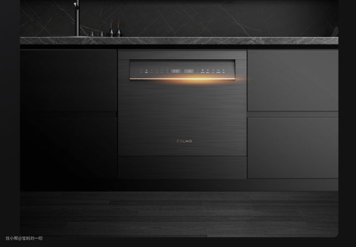 COLMO的这款洗碗机它是属于嵌入式安装的,银丝铝把手仅有4mm,且是隐藏式设计,能够有效防碰撞;产品搭载的是BLDC变频电机配合分水阀,能够满足不同洗涤程序的水压,节能更净护餐具;产品支持一键智能洗,能够通过浊度传感器精准检测油污程度,并自动匹配洗涤模式,节能又便捷!