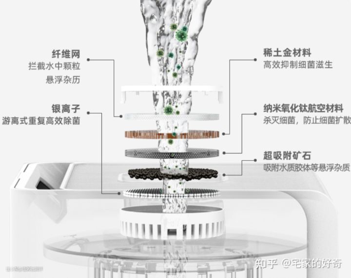 五重净化滤芯(纤维网、稀土金材料、纳米氧化钛航空材料、吸附矿石,银离子),自来水经过这五重层层净化过滤后,只剩下纳米无菌水分子,通过风道进入让纳米无菌水分子在空气中自然流动,从根源上解决了传统加湿器的空气污染、白色粉末以及桌面打湿等问题。