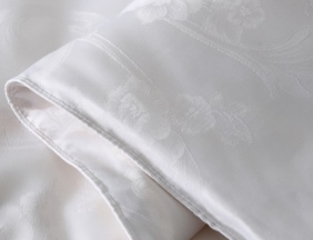 3. 被面面料:面料织造时以经线、纬线交错组成欧式卷草纹图案,大提花的质感更柔滑、更上档次。