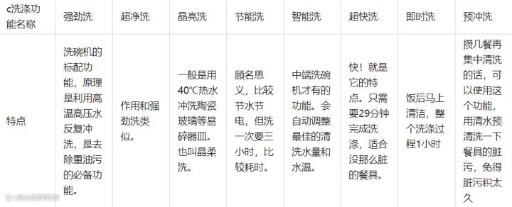 常见的洗涤功能有:强劲洗、超净洗、晶亮洗、节能洗、智能洗、超快洗、即时洗、预冲洗。洗碗机的价格还是要看洗涤功能的多少,正常情况下,功能分类越多越细致,洗碗机的价格会越高。下面简单介绍一下各个功能的特点。