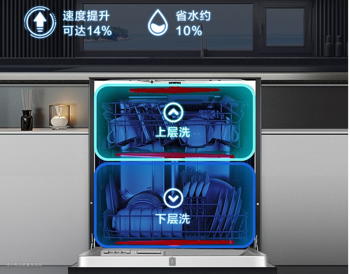 双层分区洗的设计满足少量餐具专属洗涤的需求,又避免“攒着洗”的情况,像我家中午是老人和小孩在家吃饭,攒在一起洗虽然节能,但还是容易滋生细菌,有了分区洗,就能及时清洁。而且它的晶彩触控屏,洗涤模式都是彩色图标,老人操作起来也非常容易。