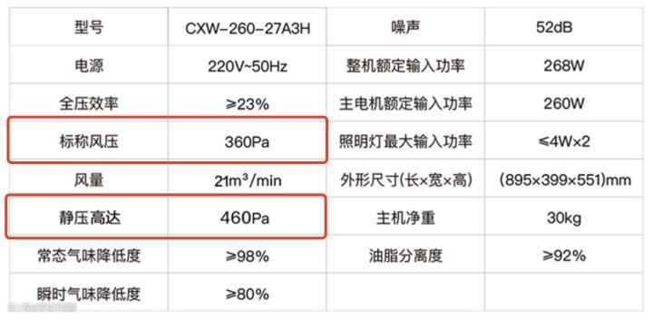 单位都是Pa表示,数值越大则排气能力越强。这两个参数我们主要关注标称风压。