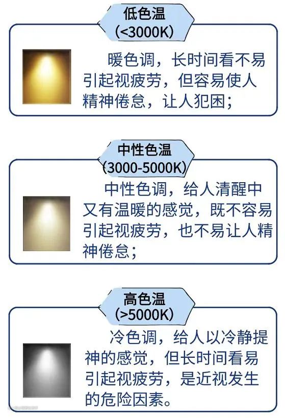 色温是指光线中包含颜色成分的计量单位。研究表明:2700K的暖黄光能够让人身心放松,4000K的黄白光能够缓解眼部疲劳,5700K的高色温白光能够提高专注度增强记忆力;考虑到高色温会影响人体褪黑素分泌,不适合在夜间使用,所以台灯色温选择不超过4000K就可以了。