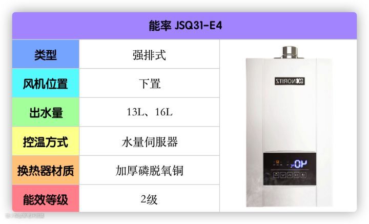 能率的这款E4搭载了水量伺服器,支持低水压启动、支持旁通混水技术、无极换挡燃烧技术、停水控温技术、CO防护系统、开机自检、60分钟连续燃烧自动关机保护、智能巡航防冻等等一系列功能。