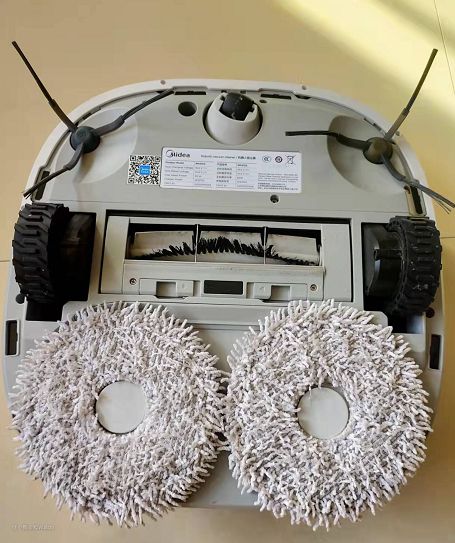 机器背面上方两个边刷在运行时可以令附近的尘埃垃圾扫进中间的滚刷并吸入尘盒。当切换为拖地模式时,水箱会为下方两块旋转拖布注水,实现拖地清洁。