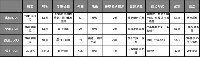这个不像气囊,越多就是越好,作为体验者,巴不得它来个几百套程序。程序越多,体验到的按摩方式就越多,从上面四款来看,西屋的按摩程序最多,其次是奥佳华和荣泰。傲胜相对少一些,多变的体验感可能不是那么强。