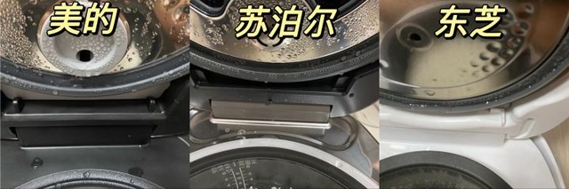 在煮饭的过程中,美的的蒸汽是最多的,在完成烹饪后打开锅盖时,相应的香味会少一些,东芝和苏泊尔一打开顿时感觉米香四溢。