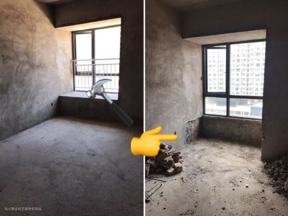 飘窗分为内飘和外飘两种,像这种这种窗体凸出墙面的外飘窗,底部悬空,坚决不能砸!砸了就漏风,后期还得给人家补上。