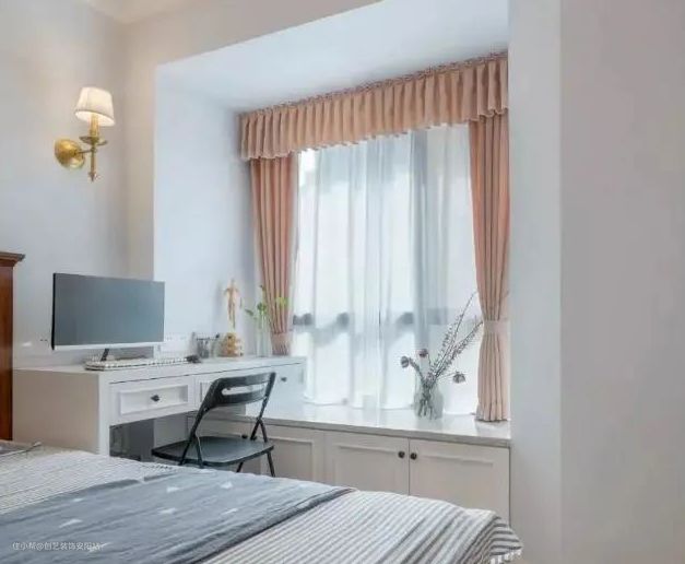 或者直接将书桌/梳妆台的一部分搭在飘窗上,也是现在比较多家庭选择的一种设计,还能保留一部分飘窗作休闲区。