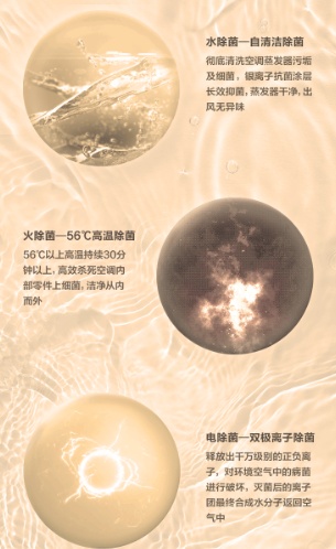 “水”就是蒸发器降温产生凝露冲刷灰尘,“火”就是56度的高温持续30分钟,从而高效杀灭空调上的细菌。“电”则是通过双极离子释放出千万个正负离子,对空气中的细菌、病毒进行穿极杀灭。