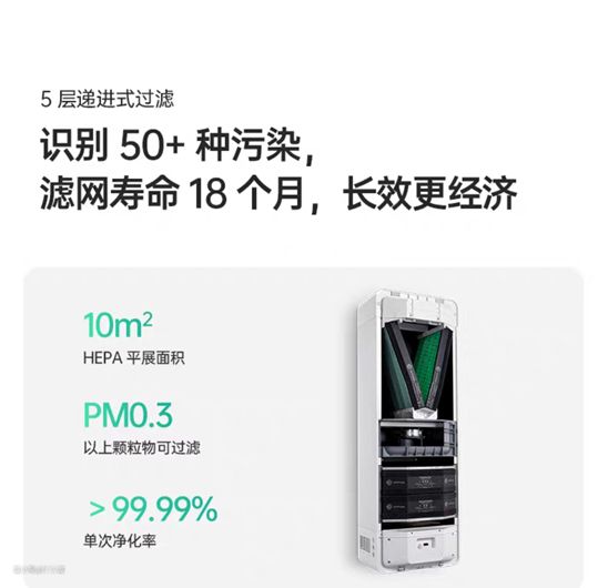机器里面装置了四层递进式过滤组合(初效水洗+F7初效滤网+TVOC滤网+H13/14级HEPA滤网),能做到精细净化各类污染物;