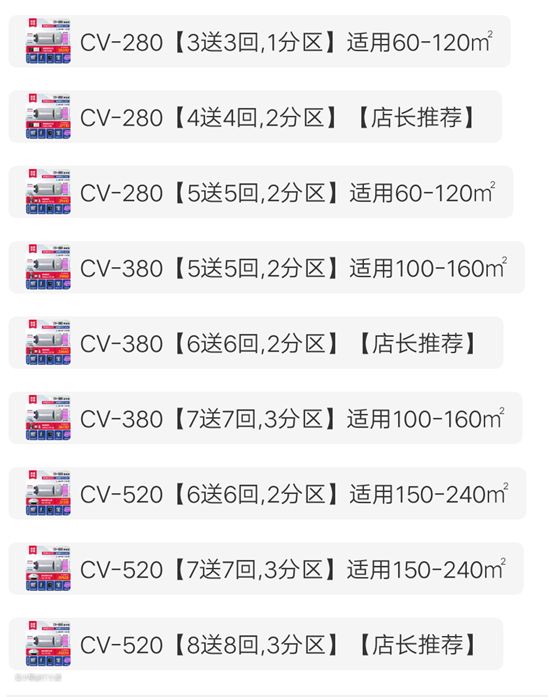 这款中央新风系统共有三个型号:CV280、CV-380、CV520,型号不同,配置不同,风量也不一样,可以应对60㎡-240㎡的空气净化,也能满足不同户型的净化需求。