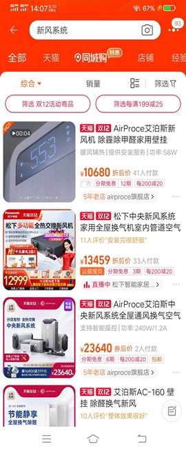 在某宝电商平台上搜索“新风系统”,引入眼帘的就是艾泊斯与松下这两个品牌,这两个品牌的销量和口碑都不错。