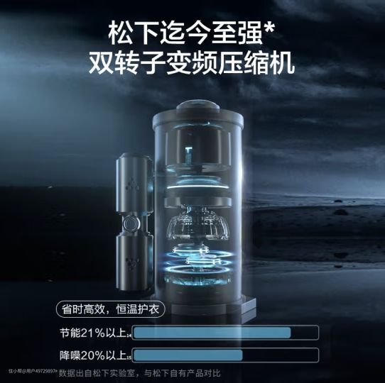 松下干衣机这块有61年的专业研究,非常有实力。因为采用了这种形式的压缩机,效率大大的提高了,单次可高效省电21%
