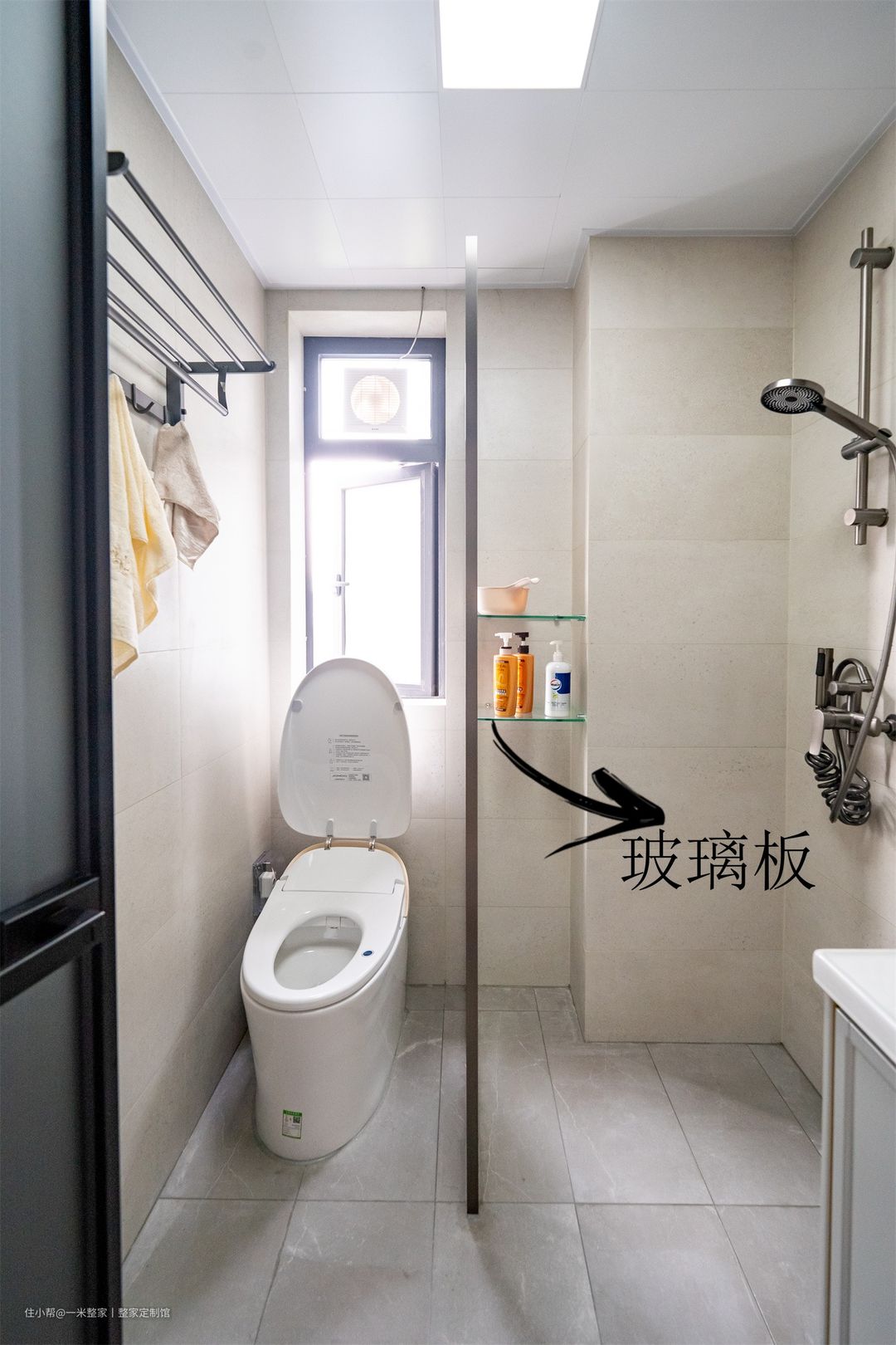 这是最常见的干湿分离方法。米米建议优选超白长虹玻璃,颜值高,防潮抗爆,又容易清理。