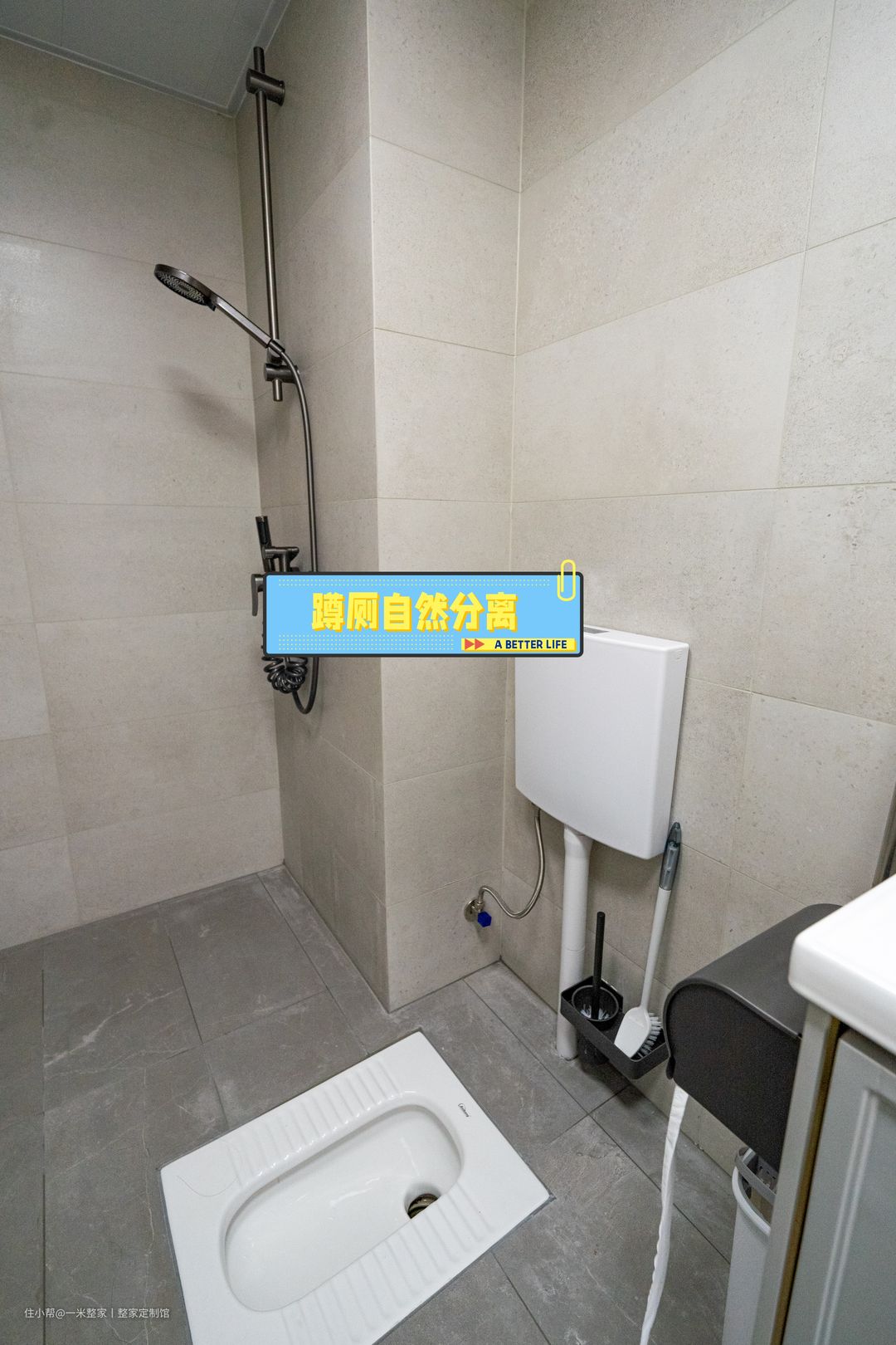 虽然米米很推荐大家都做干湿分离,但如果卫生间选用蹲厕的话,不做干湿分离也不是不行。因为蹲厕可以让洗澡水自然地流下去,不做人工的干湿分离,也不会过多增加清洁难度。