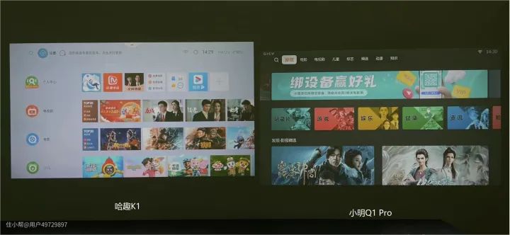 哈趣K1、小明Q1 Pro和知麻Z1的系统内存都有2G,微果D1只有1G,理论上系统流畅度会差点。不过微果D1的Luna OS属于旗舰级智能系统,占用的内存比较小,实际运行速度会比较快,而且开机没有广告(这点值得一赞),5秒左右就能完成开机。小明Q1 Pro在我选取功能时稍有卡顿,不过整体来说,四款投影仪的系统流畅度都还不错。