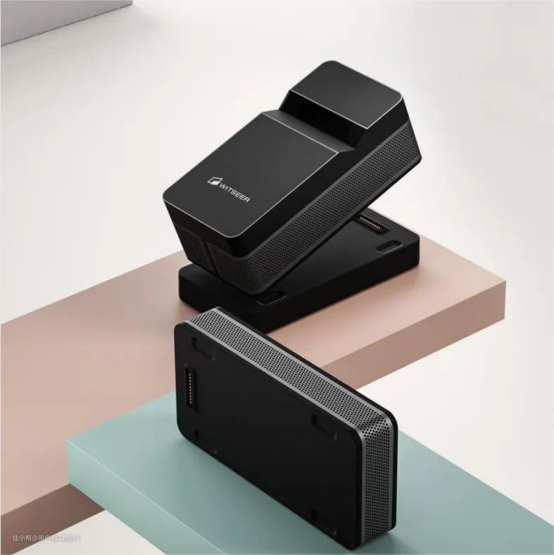 然后我们再来看一下产品的细节,P9采用的是长方形机身设计,有黑、白两款配色,走得是时下流行的简约大方的风格,和现代家居的装修风格也比较吻合,机器一共有两个可扩展模组,分别是5000mAh移动电池模组,脱离电源也能正常使用,偶尔去朋友家或者去露营也可以用。另一个是音响模组,10W大口径单元,低音下潜可以到70Hz,能够带来更震撼的低音效果。两个部分可以轻松组合,我还是第一次见到这样款式的投影仪,这或许也是“碰碰投”名字的由来吧。