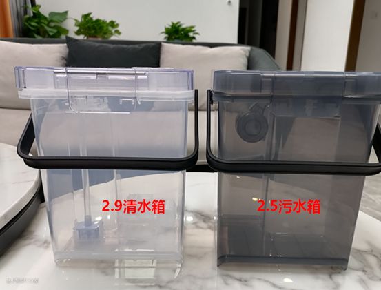 石头G10在基站上下了一定的功夫、在外型上并没有采用云鲸那大大的基站+2个5L的大水箱、而是采用的是黑白调配色+棱角分明的造型、其中清水箱为2.9L、污水箱为2.5L、有人可能不禁想问:这个清水箱一方面得给扫地机的水箱补水、另一方面又得洗拖布、这水真的够用吗?
