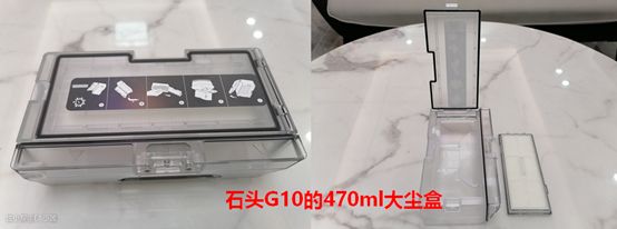 打开扫地机面板、可以看到一个470ml集尘盒~然而石头家的尘盒依旧没有配置挡板、可能是因为没有挡板的阻挡能更加高效的集尘。