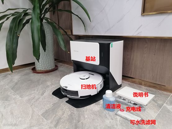 包含基站1个、扫地机1个、说明书1个、清洁液1瓶、充电线1个、可水洗滤网1个。