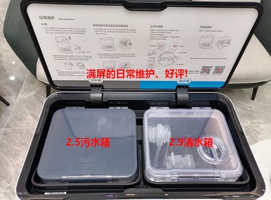 打开基站面板、第一眼看见的是满屏的使用说明书、第二眼才是清污水箱。