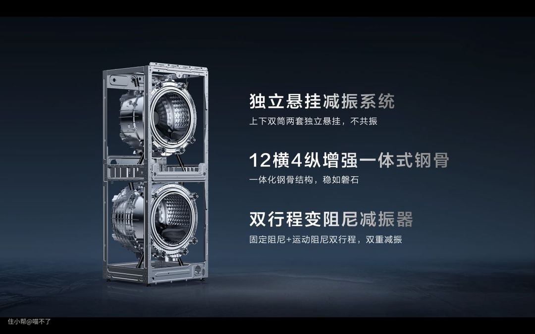 开头用了建大楼需要地基和承重墙够稳定才能建得高的例子,来讲复式洗衣机也需要更稳定的结构方案才能实现上筒大容量和稳定运行。