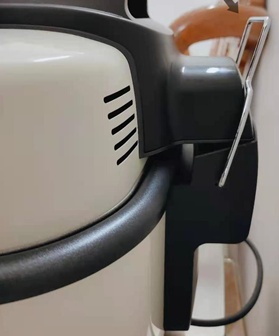 空气炸锅的盖子的背部是耦合器卡扣式的设计,卡扣是加粗的不锈钢材质,能牢牢将锅盖卡住,不用担心家里的皮孩子能把这个锅盖打开,非常安全