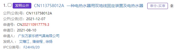 - 参考对象:《 一种电热水器用双地线固定装置及电热水器》专利申请号CN202110917779.3,申请人: 广东万家乐燃气具有限公司。