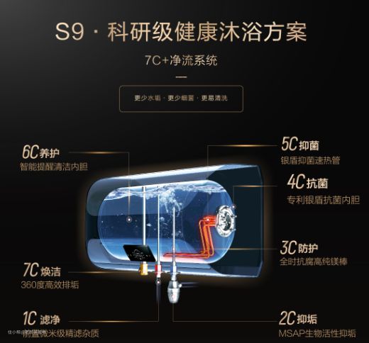 功能性方面S9主打的是健康系统,所以内胆搭载万家乐黑科技“7C+净流系统”,提出淋浴“健康水”的概念。下面是这个健康生态内胆过滤科技的照片,大家可以了解一下高端机型的过滤防护到底可以做到什么程度。