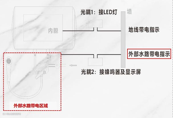 实现方式如下面的原理图所示:线一端接外部水路带电区域,一端接墙(地),中间串光电耦合模块,当外部水路带电时,驱动蜂鸣器报警和显示屏警示。热水器可以给用户语音播报警示,提前提示用户,降低外部环境漏电对人体造成的伤害。