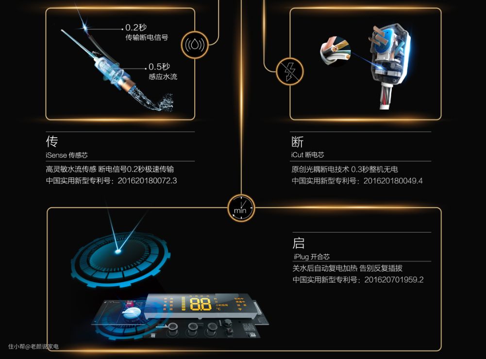 “无电洗”整个断电系统由三个合芯组成,分别是iPlug开合芯、Sense传感芯和iCut断电芯。