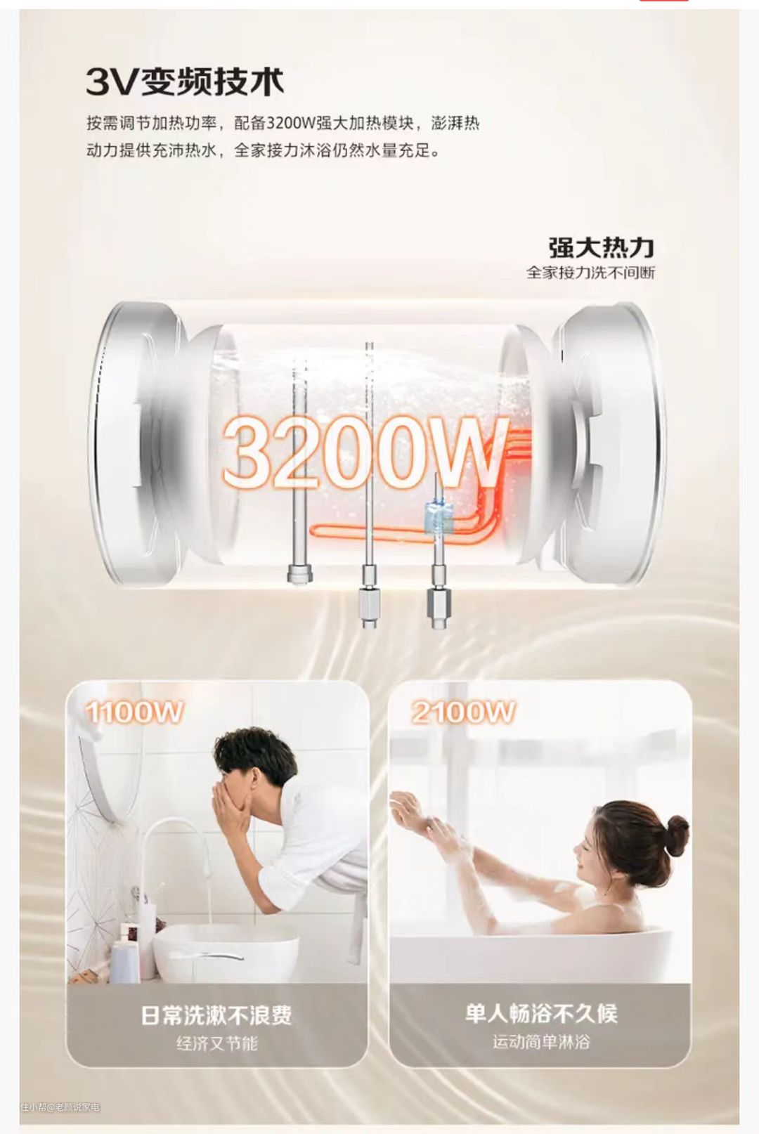 此外,主打的双胆速热更是核心中的亮点,2100W功率哪怕家里是老旧小区也不用担心电路因老化而跳闸。