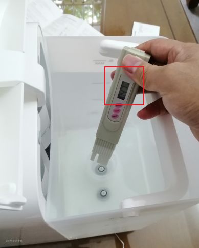 不知道有没注意到旁边显示自来水的TDS值为74,前面提到家里的自来水TDS值为47,怎么这里是74呢?因为反渗透净水器是有废水产生的,而净饮一体机的废水是回流到水箱里,因为要保证机器可以随处放,而废水总不能排到地板上呀;所以,产出纯净水后,水箱里的自来水因为废水回流,TDS值自然也增高了。