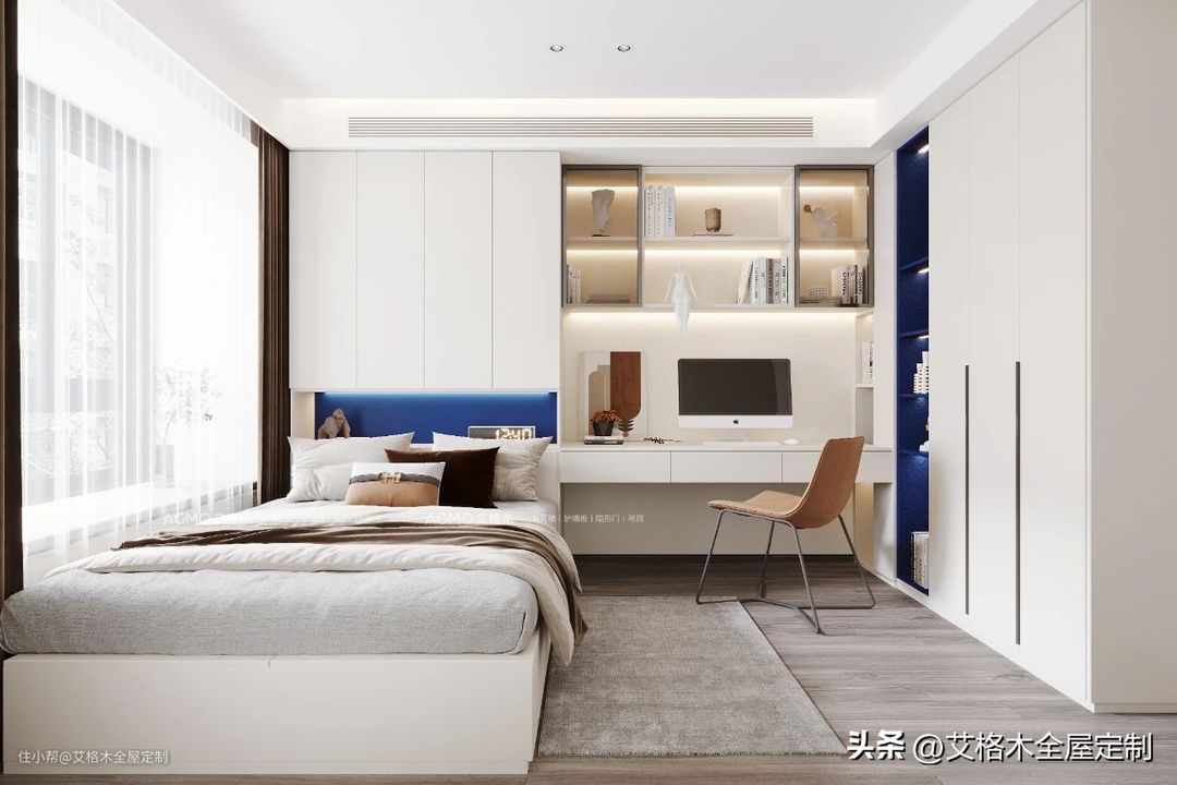 小户型卧室为了增加储物空间,完全可以配合设计一整面墙的收纳柜,可以是隐藏式,按压开合柜门,不会让门把手不小心抵到身体。