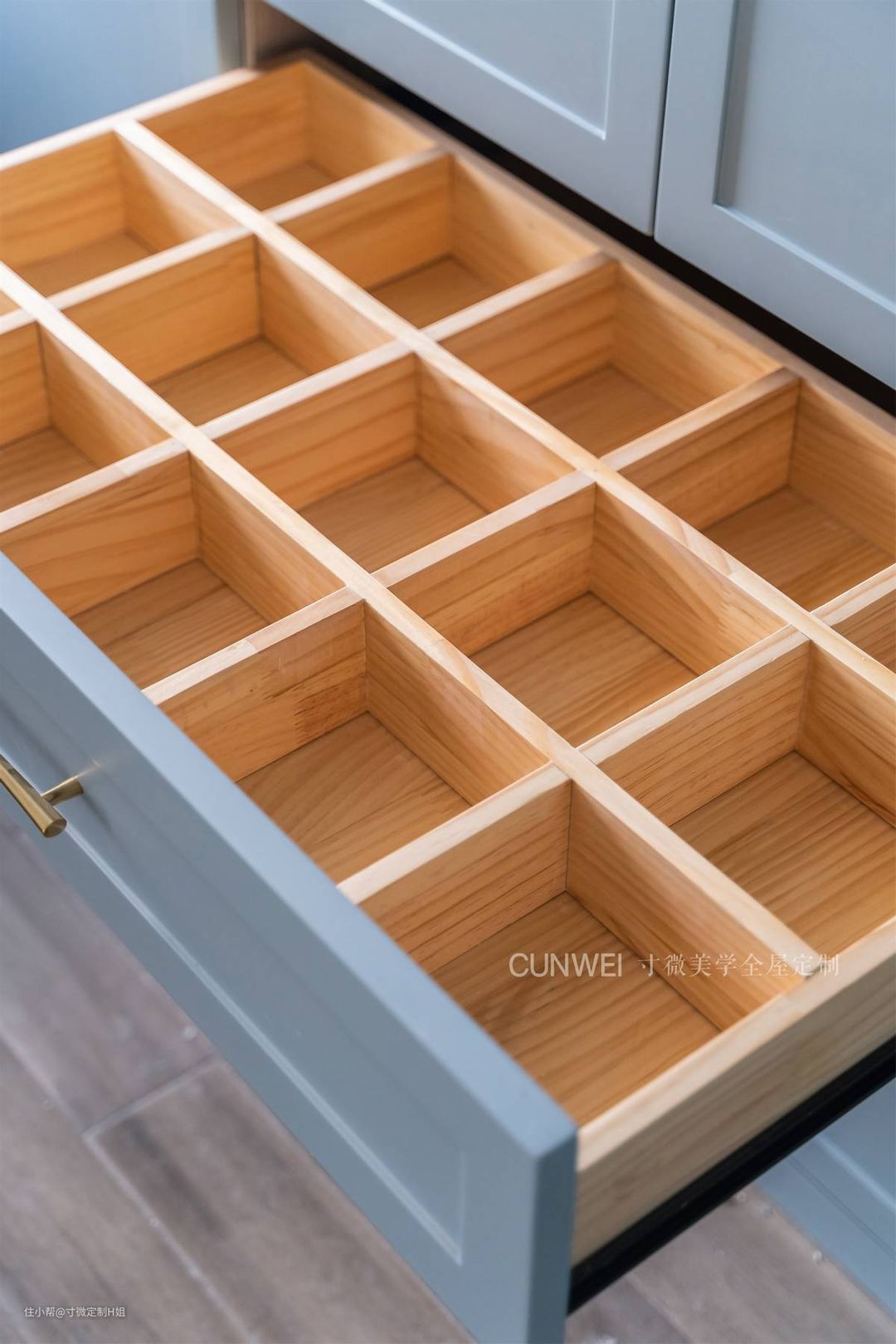 抽屉还根据屋主的生活需求,设计成网格状收纳区,可以满足各种手表、项链等小物件的收纳需求。