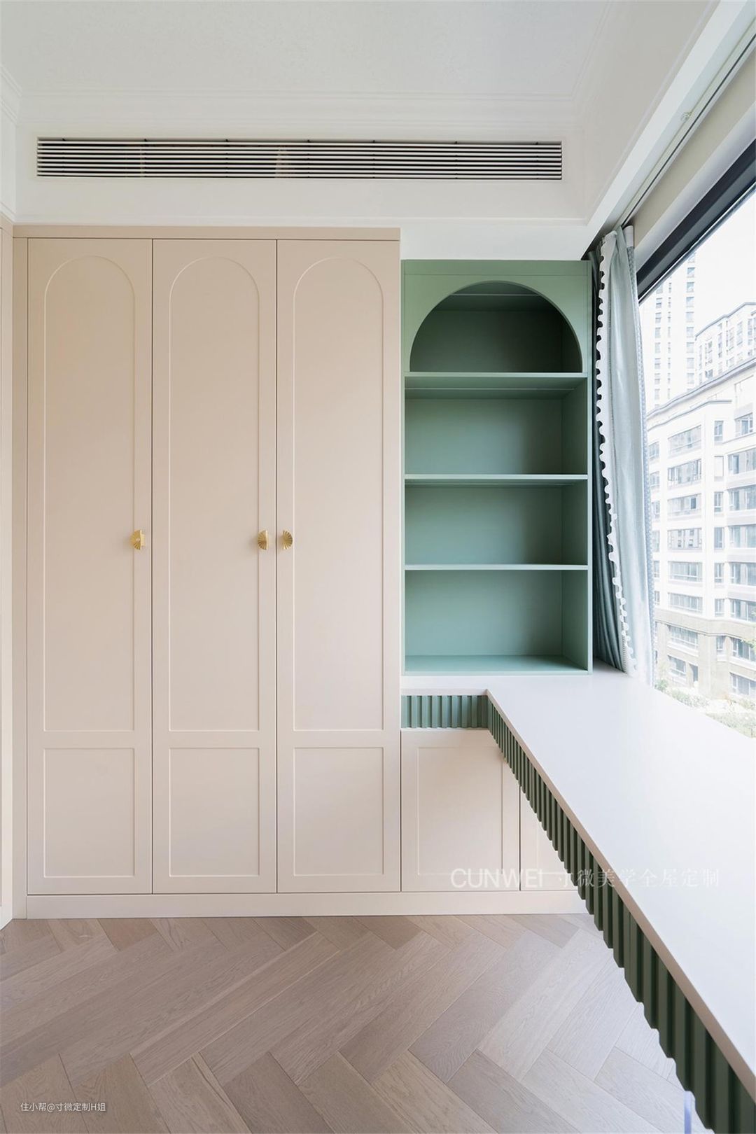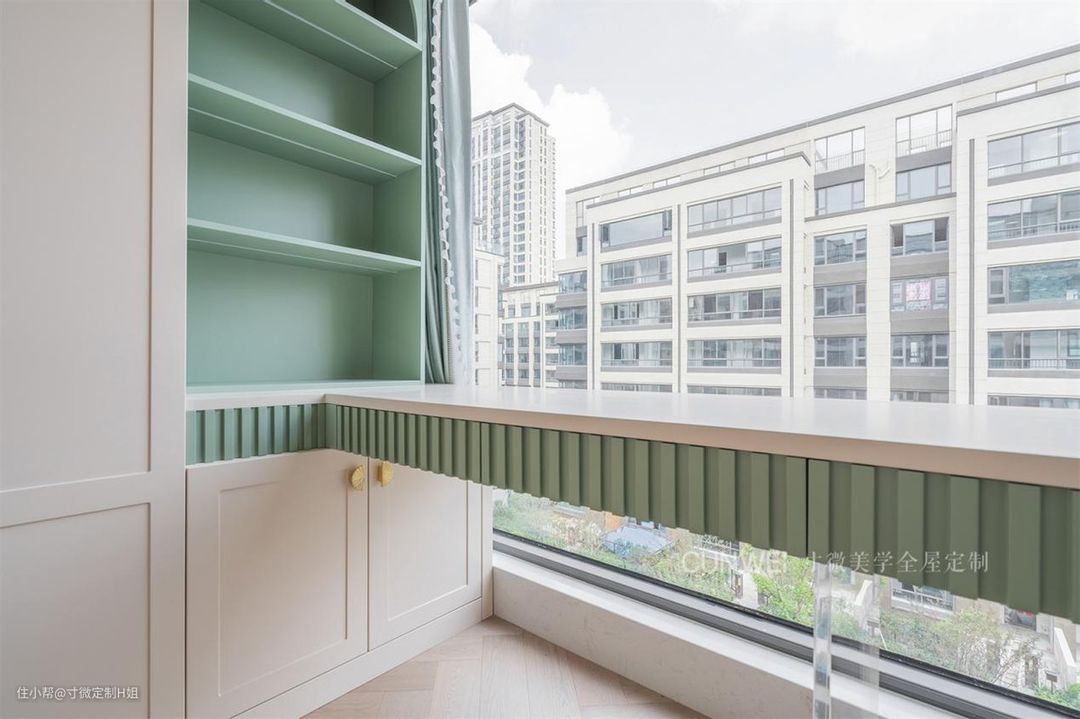 同样根据窗户位置延伸出书桌,手边加入绿色的开放式书架,用来满足常用书籍、化妆品的收纳需求,弧形元素的加入也为生活营造出更加温馨的氛围感。